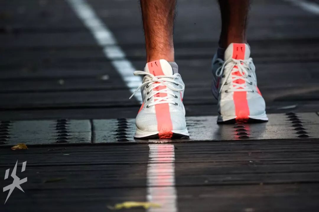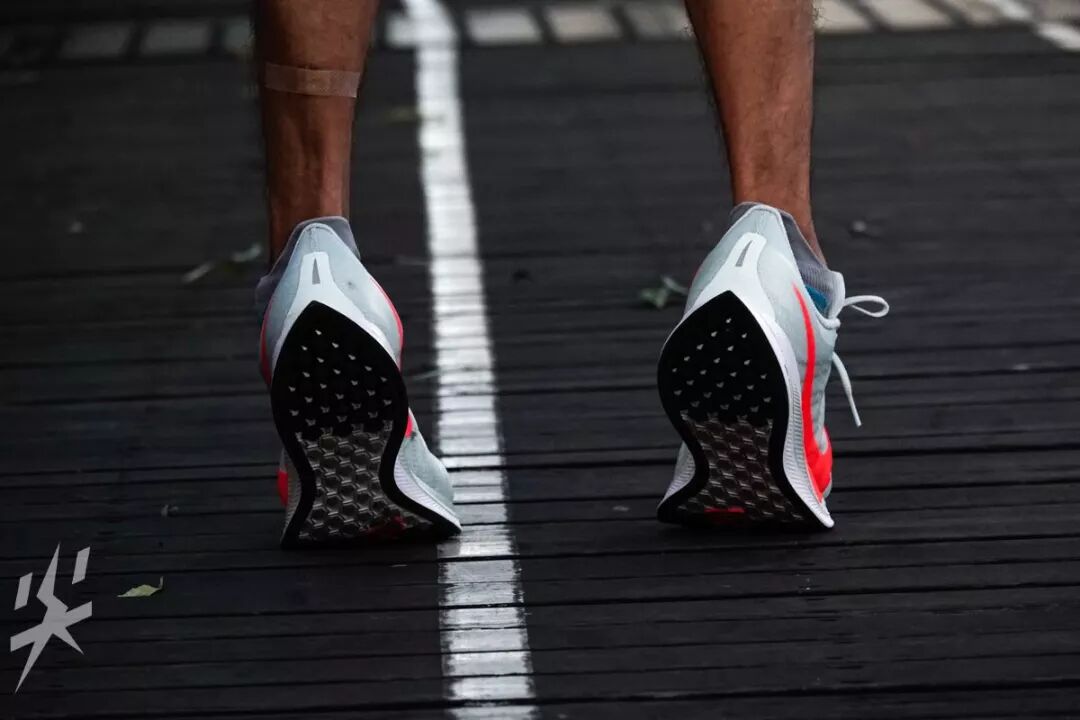 我们将Peg Turbo与Peg 35 以及4%进行了一次步态对比,试图解释跑鞋支撑性对于跑者的帮助。 显然穿着4%时,跑者在触地之后的再次离地时跑鞋会有一个明显的助推力;而到了Peg Turbo时,由于没有了神奇碳板内嵌的支撑,这种助力变得几乎无法辨识;最后在Peg 35上,我们只能依靠自己双脚的抬升了。