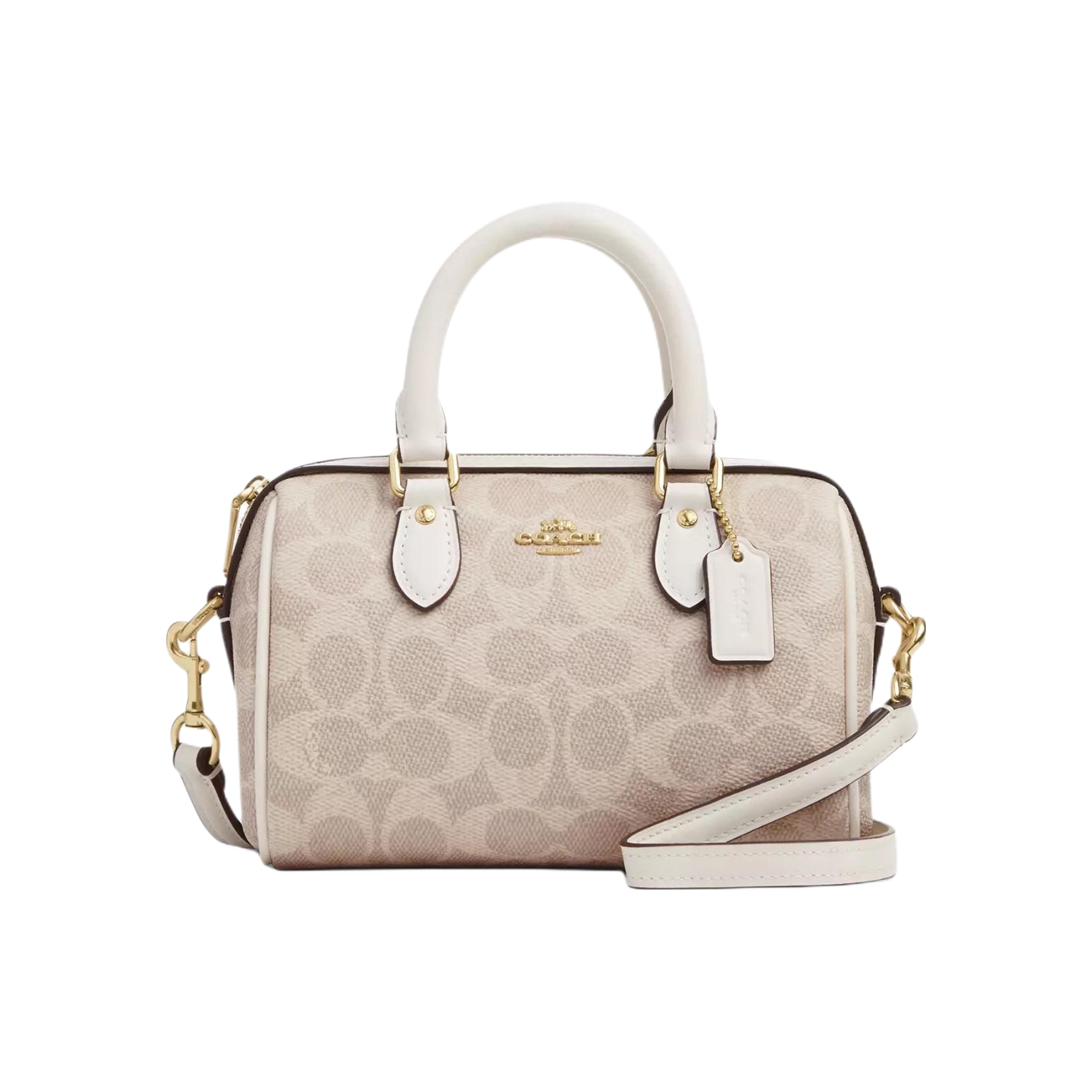 Coach Rowan 18 小号 涂层经典老花印花拉链开合PVC拼皮单肩斜挎手提包 奶茶拼白