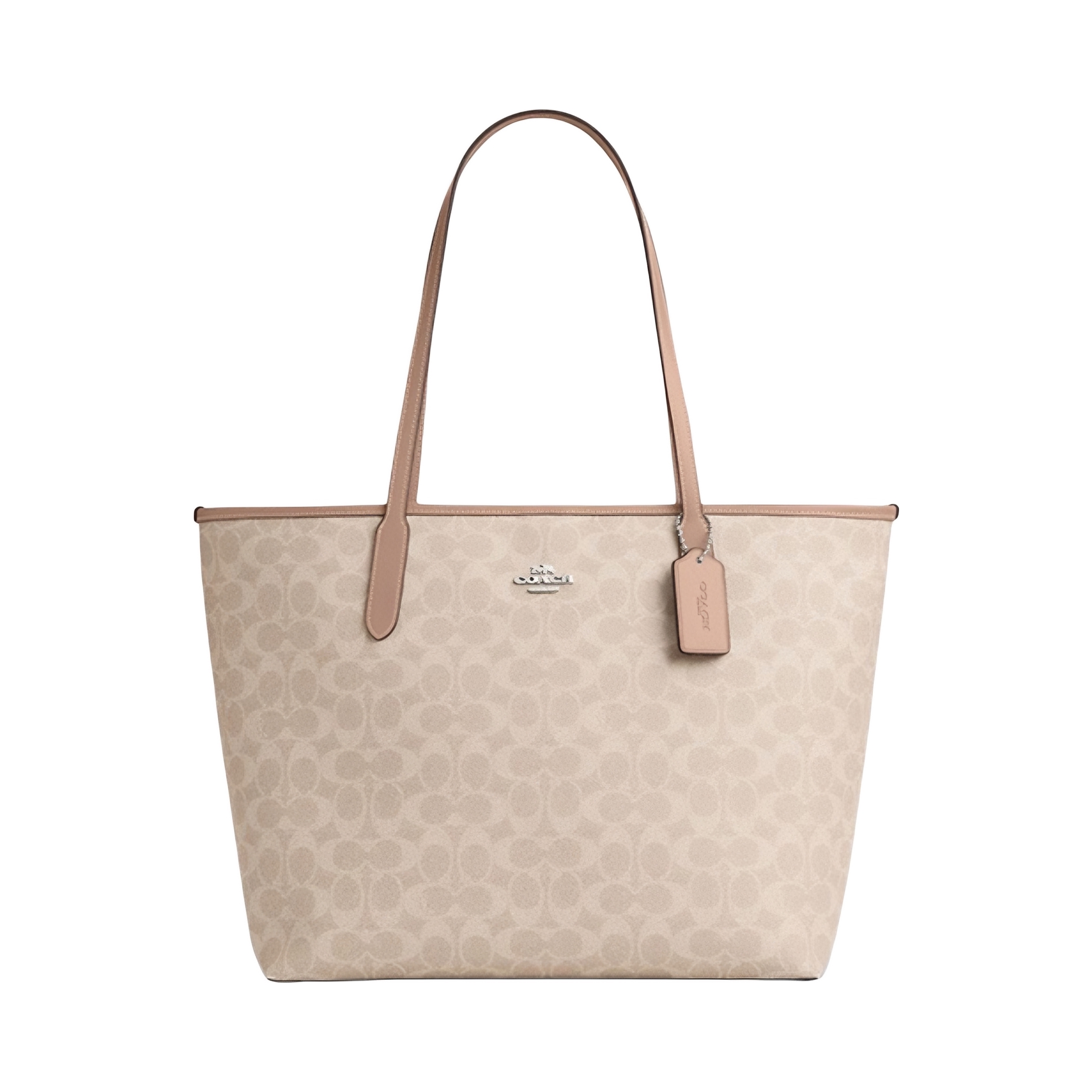 Coach city 33 磁扣拉链开合涂层PVC拼皮革购物袋单肩托特包手提包 灰褐色