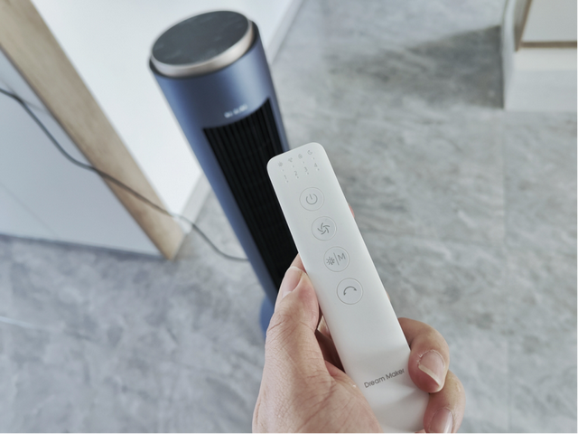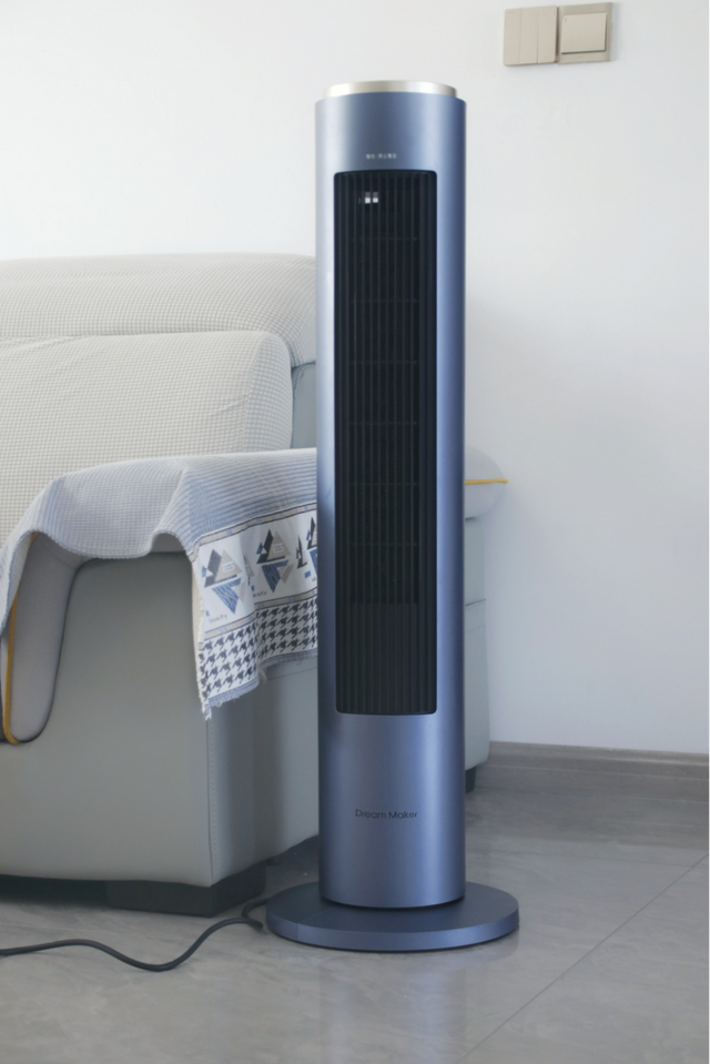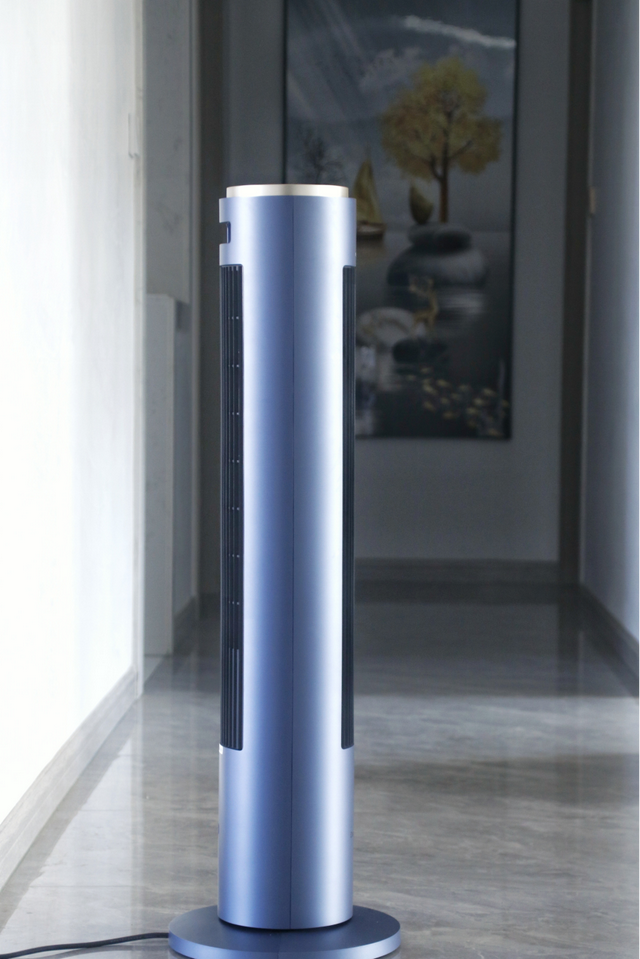 机身的表面细腻的磨砂颗粒无论是看起来还是摸起来都非常舒服。同时在配色上也非常的大胆,因为黑白是普适性最强的色彩,很多厂家为了避免出现意外通常会选择黑白色,而造梦者无叶净化冷暖扇这次采用了普鲁士蓝搭配香槟金,这就让产品看起来非常有质感,有档次。