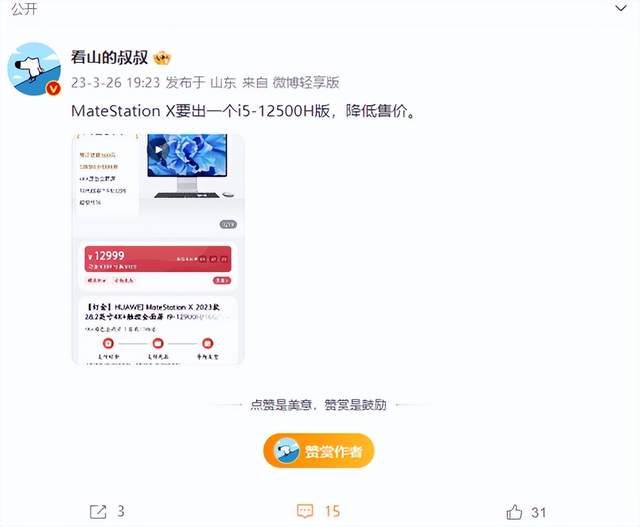 日前,华为经销商“看山的叔叔”爆料称,华为MateStation X将推出搭载 i5-12500H处理器的版本,售价也会降低,与酷睿i9版相比,前者算是低配版了,价格可能会在万元以内。