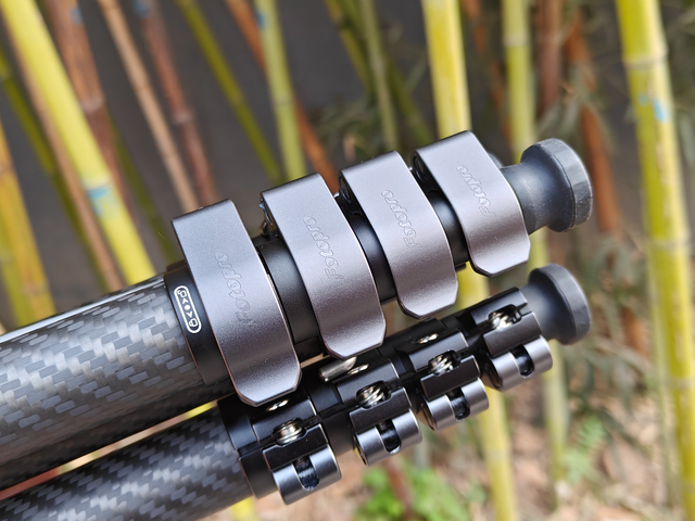 板扣式相比旋钮式开合方式更容易掌握旋钮力度,左边开合设计便于拇指操作,易于发力。整体三脚架高度可以达到1.6M,中轴不升高也能有1.3M的高度,高个子用户也可以轻松拍摄。