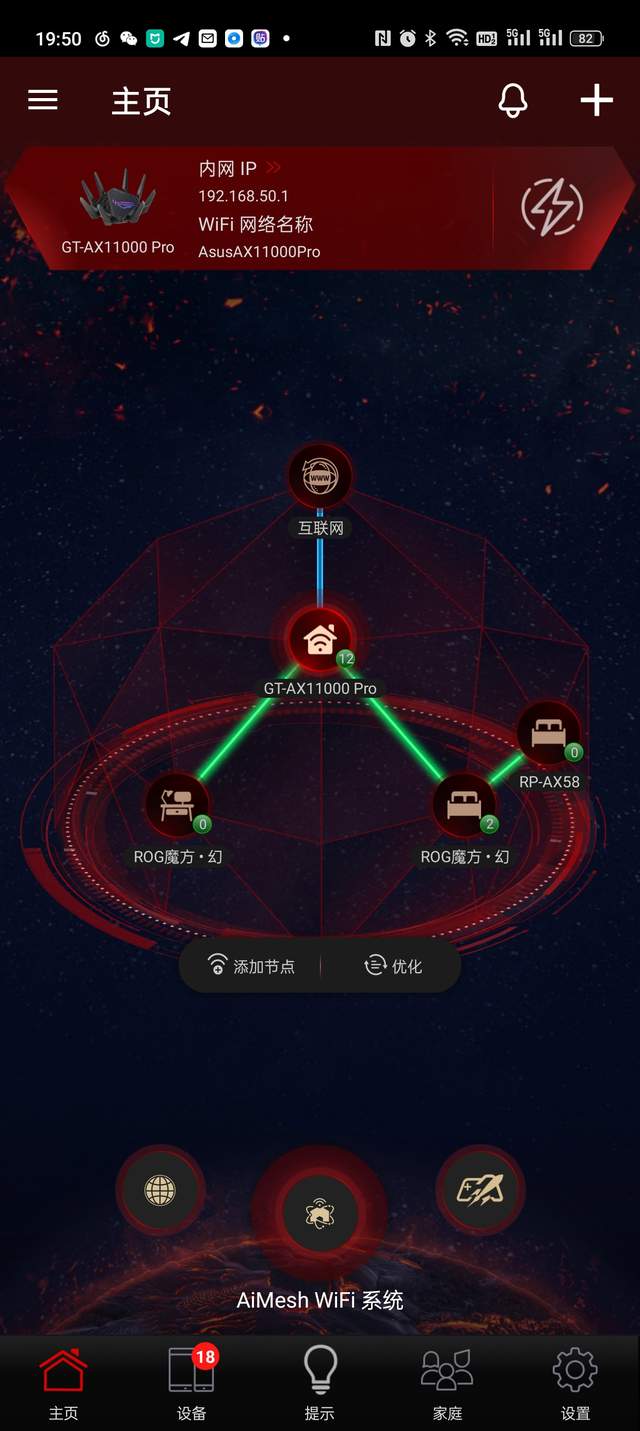 接入华硕系MESH的方法比较简单,通过华硕路由器官方的手机App即可完成操作,设备仅需通电开机,我这里现有的拓扑是华硕AX11000Pro和两个魔方幻组的Mesh。