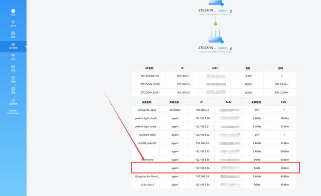 配对后进中兴的后台看了下,这台华硕RP-AX58作为常规下联设备显示在设备列表,实际上已经是无线中继器模式了,后续如果没有特殊设置,正常通过中兴后台管理和配置网络。