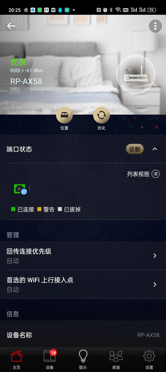 通过App可以看到该节点的信号强度为-61dBm,无线信号覆盖能力一如既往的强悍,正常-90dBM以内都可以作为子节点稳定使用,建议控制在-70dBM以内为佳。