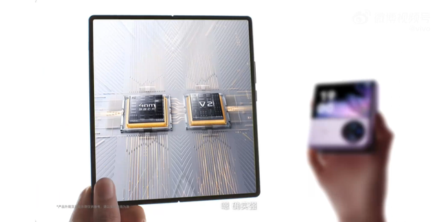 关于这两款折叠屏手机的相关信息,vivo官微也是发布了一些宣传视频。从视频截图中不难看出,vivo X Fold2的外观设计和上代相比基本上没有太大变化,屏幕展开后一体化程度高,屏幕折痕基本看不见,手机背面疑似采用了素皮+玻璃的设计方式,整体辨识度更高。同时视频中还爆料出vivo X Fold2内置了4nm旗舰芯片(猜测为骁龙8 Gen2)+自研芯片V2,支持快充,主打全能轻薄特性。