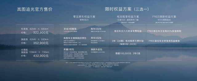 同时,岚图还为不同需求的用户准备了限时购车权益方案:一是零压拥车权益方案,包含定金3倍膨胀(5,000元抵15,000元膨胀金)、购车0压包(限额20万3年0息/10万5年0息)、质量0忧包(首任车主六大终身免费权益)、岚图车主增换购回馈包(岚图FREE及梦想家车主增购追光可享新车保险免费(一年)、换购追光可享新车保险免费(一年)或权益继承)、用车0压包(终身免费充电2,400度/年、终身免费保养)、焕新升级包(全品牌置换享15,000元补贴),让用户轻松拥车,使用0压力。二是电池租享权益方案,包含首任车主六大终身免费权益、3年(36期)电池租赁月费补贴(每期补贴1,000元)、限额100,000元 3年0息。三是FREE焕新权益方案,包含FREE首任车主至高85%保值换购、FREE首任车主终身类权益继承,用户8万元即可换购追光。