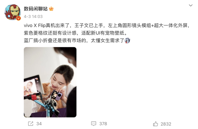 另一款折叠旗舰是蓝厂的首款小折叠vivo X Flip,从与艺人王子文的同框合影能看出其采用了横向超大一体化外屏的独特设计,倾向于定位女性用户。