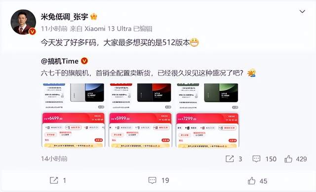 网友发现小米13 Ultra在京东全版本都卖断货了,已经很久没有看到这种盛况了。小米集团张宇表示,他发了很多F码给用户,大家最想要的是512GB版本。