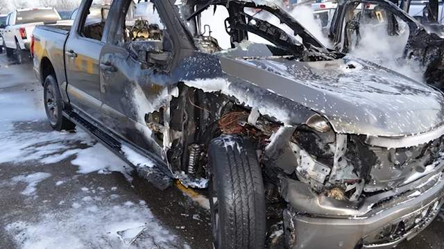 最终,引发火源的那辆F-150 Lightning几乎变成空壳,轮胎也熔化。另外两辆,同样严重受损。