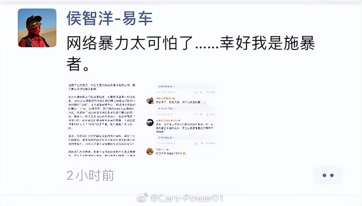 一位疑似易车员工张某星的朋友圈称其一天喜提两个热门;另一位疑似易车员工侯某洋的朋友圈称网络暴力太可怕,幸好自己是施暴者。