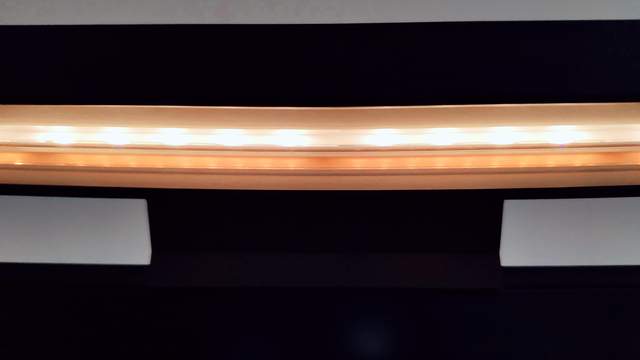 顶部五十个RGB灯珠,以亚克力面为承载体,主灯共分为两排,前排主灯为暖色与冷色间歇排列九个一组共十组合计九十个灯珠,后排靠近屏幕一排数量上与前排一致,灯珠方面全部为暖色灯珠九十颗。
