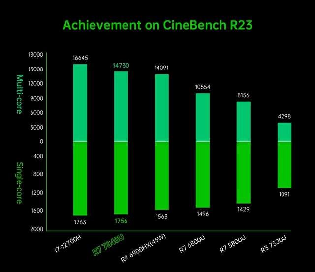 CPU 方面,在 Cinebench R23 跑分中,R7 7840U 单核 1756 分,与 i7-12700H 差不多;多核 14730 分,与上代 R9 6900HX 差不多。
