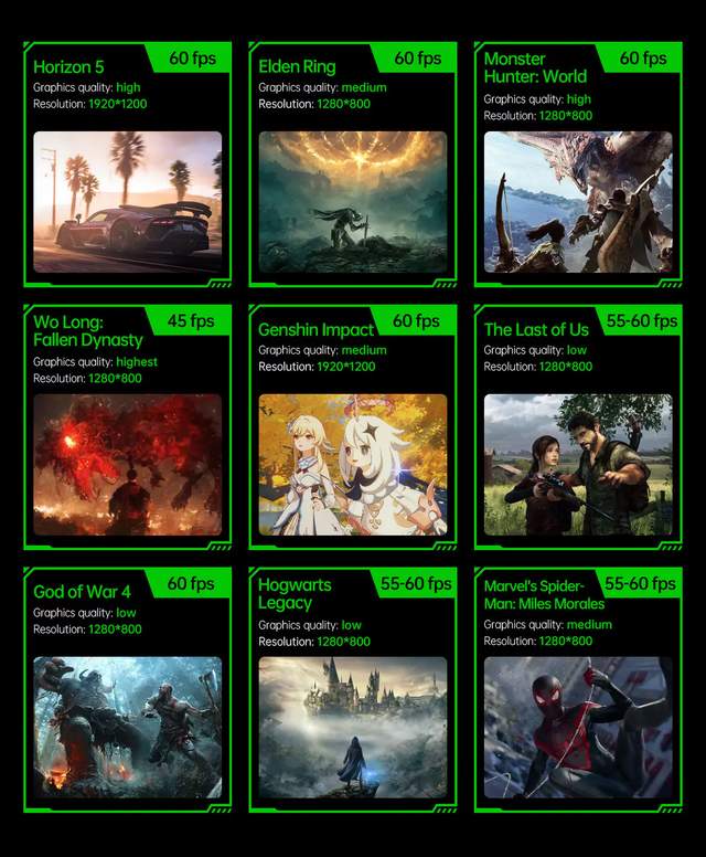 分辨率降到 800p 后,这款掌机可中画质 60fps 运行《艾尔登法环》,高画质 60fps 运行《怪物猎人:世界》。