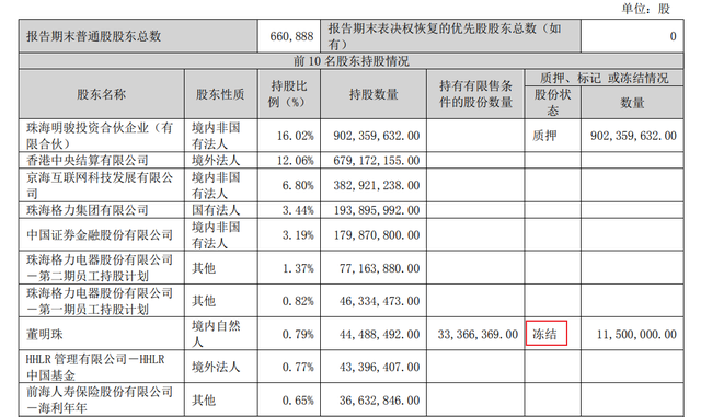 随后,格力电器发布了关于 2023 年第一季度报告的更正公告:经核查,因个别信息存在录入错误,误将截至报告期末前十大股东中董明珠女士的股份状态填写为“冻结”,现对相关内容进行更正,更正后董明珠女士的股份状态填写为“质押”。