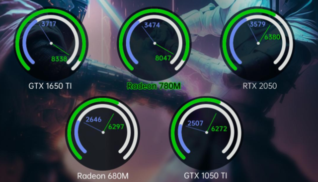 核显方面,在 3DMark 测试中,Radeon 780M 核显配合 LPDDR5X-6400 内存的表现介于 RTX 2050 和 GTX 1650 Ti 之间。