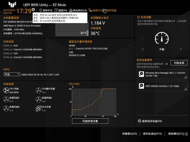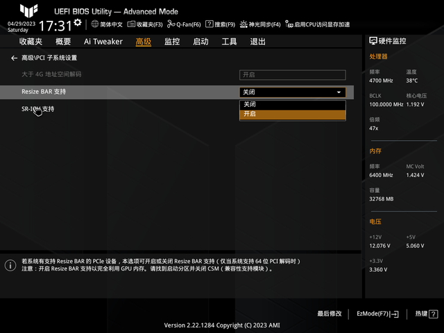 华硕主板虽然在EZ模式显示SAM和Resize Bar这俩功能已经自动开启,实际上还是得手动进高级模式修改一下: