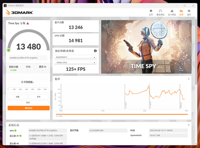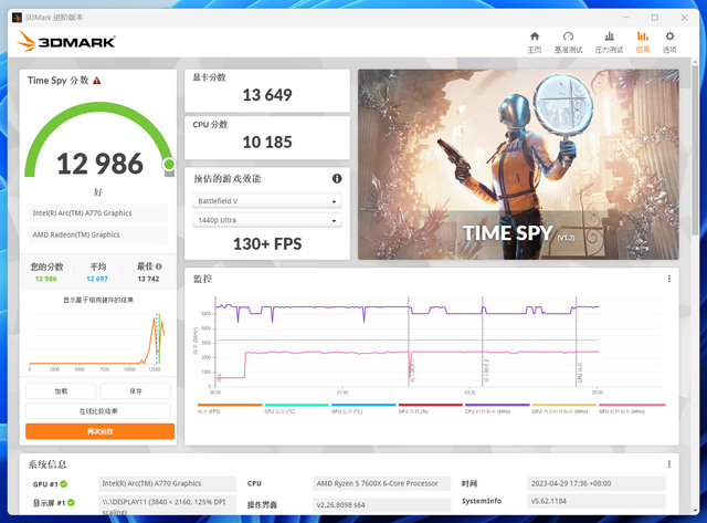 确认SAM和Resize Bar都正确开启之后,使用3DMark中针对DX12的TimeSpy测试,默认配置的测试结果如下图所示:
