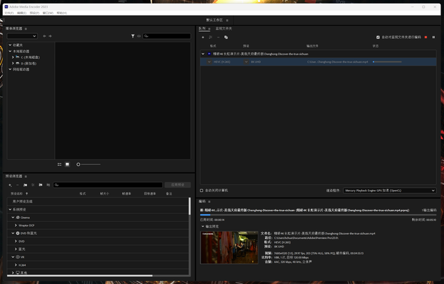 测试工具选择常用工具Adobe Media Encoder,转码素材选择老演员4K演示片美哉天府。
