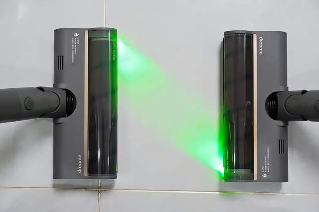 第二种则是在吸尘器的滚刷前面,安装了激光类的光源。激光光源的优势是亮度很高,且不会像LED一样分散,所以能够将灰尘阴影放大,帮助用户发现灰尘。但激光光源因为光线强度过高,光能较大,如果家中有宝宝、宠物,一旦被激光照射到,很可能会造成不可逆的视力伤害。