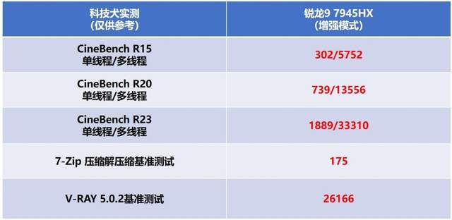 通过一张表格来快速了解ROG魔霸7 Plus超能版搭载AMD锐龙9 7945HX这款移动处理器的性能表现,具体如下图: