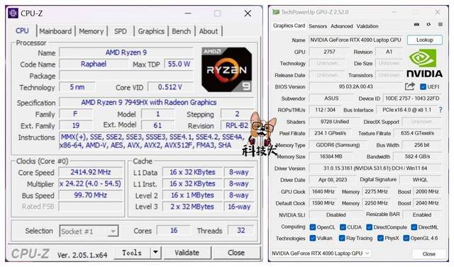 ROG魔霸7 Plus超能版主要有RTX 4090、RTX 4080两个版本。科技犬实测的评测机搭载175W满功耗版RTX 4090 Laptop GPU,其采用16GB GDDR6显存,默认频率为1590MHz,默认Boost频率为2040MHz。