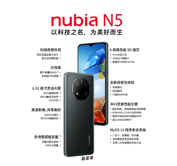 努比亚推出了一款新机——努比亚N5,采用6nm国产芯,售价1499元起。据介绍,这款手机采用了一块6.52英寸水滴屏,1600*720分辨率,具有90Hz刷新率,180Hz触控采样率,1670万色。