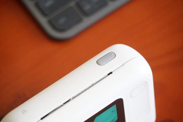 喵喵机智能学习打印机N1设有两枚实体按键,即开关机按键、录题键。开关机按键我就不多做介绍了,字面意思理解一下就OK了,在机器顶端;录题键其实可以理解成“相机快门”,按下该按键就可以拍下想拍摄的内容,在屏幕旁白。