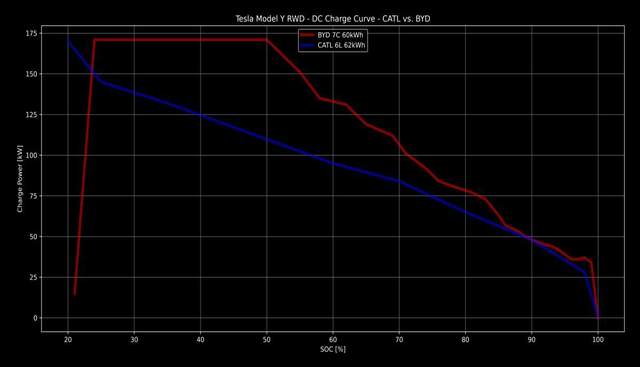 新车峰值功率可以维持在 170kW+ 区间很长时间,而且后段功率也比 CATL LFP 版来得高,还能做到充电 15 分钟 11%-71%。