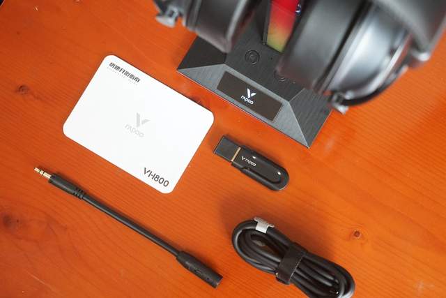 出厂配置方面,雷柏VH800双模无线游戏耳机除耳机主体之外,还附带了长杆麦克风、Type-C线缆、2.4G接收器和说明书。