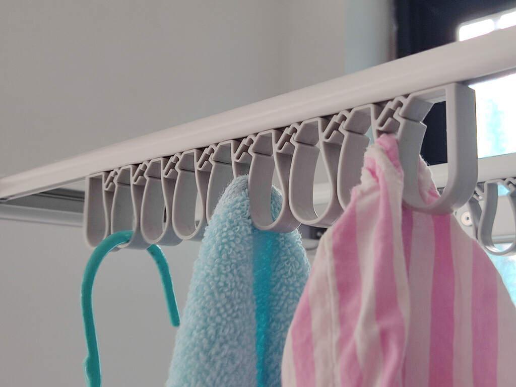 这款晾衣机两侧的伸缩杆伸缩到最长后,总长度可达2.2米,一次性就可以满足普通家庭一周的衣物晾晒需求,而且还支持分区、防风晾晒一举多得;