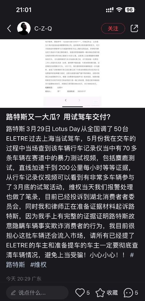 路特斯3月29日Lotus Day从全国调了 50台ELETRE过去上海当试驾车,5月份我在交车的过程中,当场查到该车辆行车记录仪当中有70多条车辆在赛道中的暴力测试视频,包括麋鹿测试,直线加速干到200公里每小时等等证据。