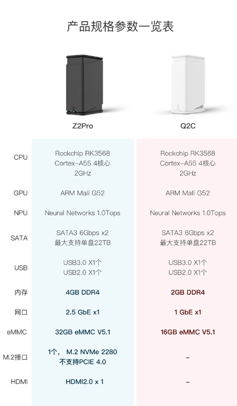 Q2C和Z2Pro均采用瑞芯微Rockchip RK3568解决方案,在市场上基于ARM架构的私有云产品里,性能指标首屈一指。Q2C体积更小巧,主打“够用、好用”,更大限度降低购买门槛的同时,软件功能并未缩水,依旧提供了极空间口碑优异的软件功能和使用体验,力争让更多普通消费者更容易享受到私有云这一极大提升生活便利度和乐趣的“数字存储神器”。Z2Pro则更突出“全能”特性,虽然定位于千元机,但越级提供了2.5G网卡,网络传输速度全面飙升,让机械硬盘的传输再无瓶颈;NVME协议SSD的加持,小身材大能量,在提供1000MB/S的超高速体验同时,带来了绝对的静音,让用户彻底告别机械硬盘读写时烦人的“哒哒”声,生活、工作甚至睡眠都再不被打扰;HDMI2.0端口则是不得不提的一大亮点,支持4K60hz超高清输出,轻松播放蓝光4K影视作品,主流的H264、H265等诸多视频格式更是统统不在话下,配合极空间多年口碑一贯出众的“极影视”、“极音乐”等功能,给用户带来近乎完美的视听体验,影音爱好者实在不容错过。