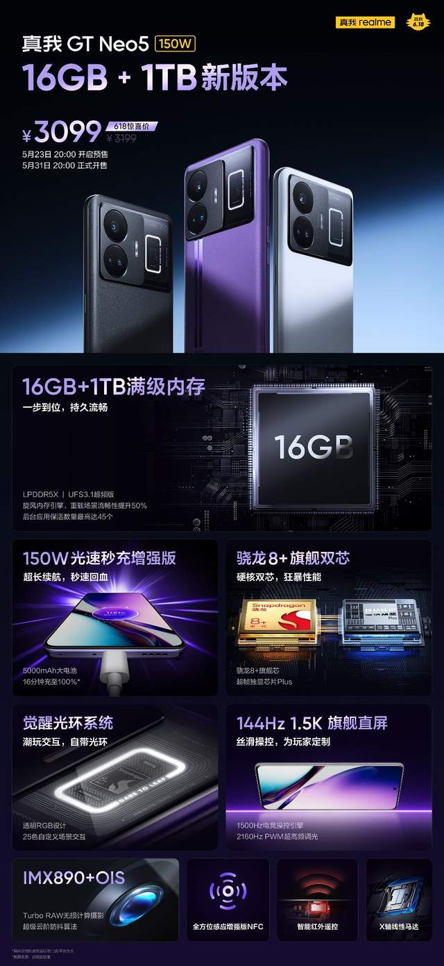 引领行业1TB普及风暴的真我GT Neo5系列,这次也补齐1TB内存最后一块版图,真我GT Neo5 150W正式解锁16GB+1TB新版本。至此,真我GT Neo5全系标配1TB,并且真我搭载1TB的新品全面覆盖2K-3K价位段,让满级存储风暴更加彻底!