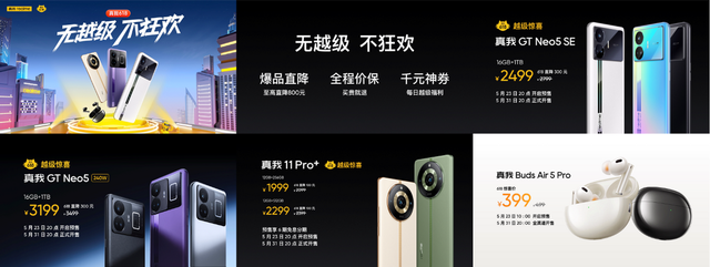 爆款出击,王牌当道!真我618一举放出五大越级王牌!首先,真我作为“可能是行业1TB 机型最丰富的品牌”,以真我GT Neo5系列与真我11Pro系列携手打造第一张“1TB大存储手机王牌”; “3K 档超强闪充王牌”真我GT Neo5至高立减300元,240W 16GB+1TB版到手仅需3199元;“2K 档性能续航王牌”真我GT Neo5 SE至高立减300元,16GB+1TB版到手仅需2499元;“2K 档质感影像王牌”真我 11 Pro+行业首发2 亿新影像,让变焦更自由,也带来百元优惠低至1999元,预售可享6期分期免息!“千元内旗舰耳机王牌”真我 Buds Air 5 Pro上演音质、降噪、体验全面Pro,618惊喜价399元!