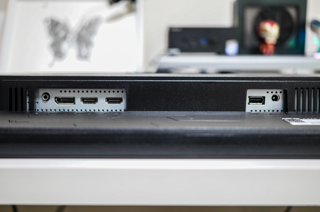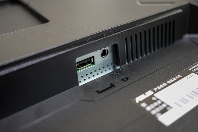所有的输入接口都在背部下方,包含了DP1.4接口*1、HDMI2.1接口*2、3.5mm音频接口*1、USB3.0接口*1和DC供电接口。