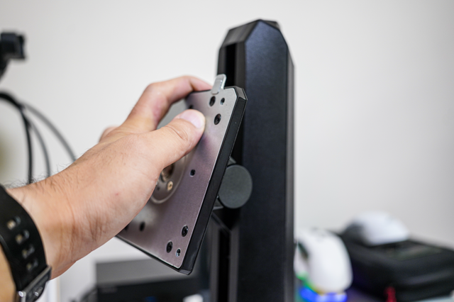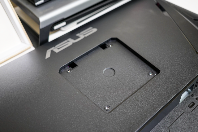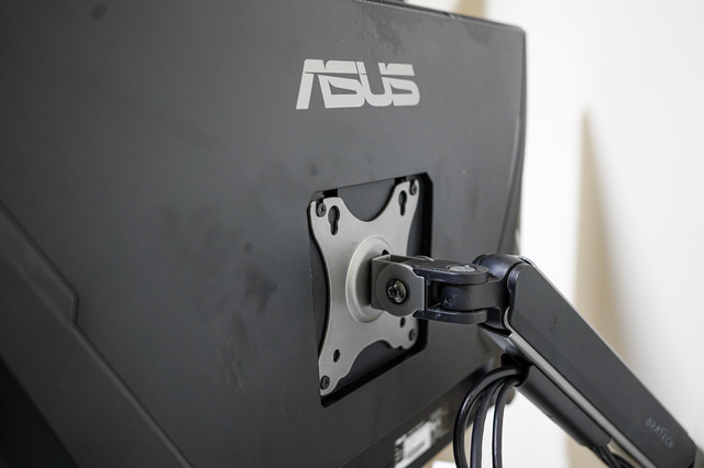如果你不喜欢原装支架,亦或者桌面太小不好摆放,华硕小金刚Pro 2023也支持几乎所有的第三方支架/支臂,看着背部接口虽然不规则,实际上是100*100的标准接口。