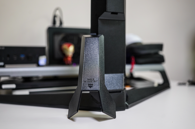 在接口的背部则预留了可拆卸的理线槽,和支架靠卡扣安装连接,孔位预留的比较大,可以轻松放的下电源线和DP/HDMI线材。