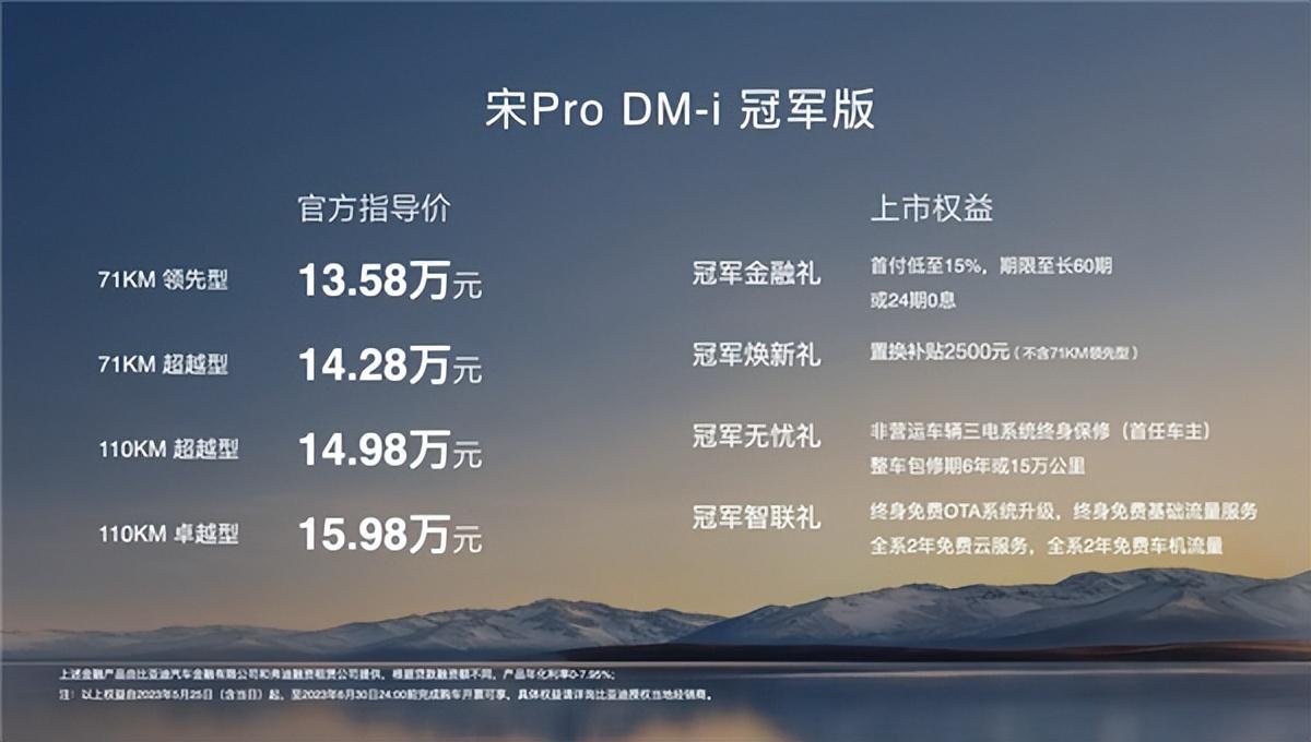 比亚迪宋Pro DM-i冠军版正式上市,共推出4款车型,售价区间为13.58-15.98万元 ,同时推出了购车政策,详情见下图。