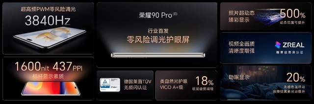 荣耀一直致力为用户提供顶级的护眼体验及前瞻性的屏幕技术创新。此次荣耀90系列创新带来“零风险调光护眼屏”,全球首发行业最高3840Hz超高频PWM调光,并获得TÜV莱茵无频闪认证,带领行业迈入屏幕频闪零风险调光时代。超高频的PWM调光还拥有优于DC调光低亮度显示效果不佳的优势,克服了低频PWM调光易导致视觉疲劳的问题,能够兼顾饱满色彩和护眼体验。根据IEEE Std1789-2015国际标准,当屏幕闪烁频率大于3125Hz时,频闪对人眼无风险。