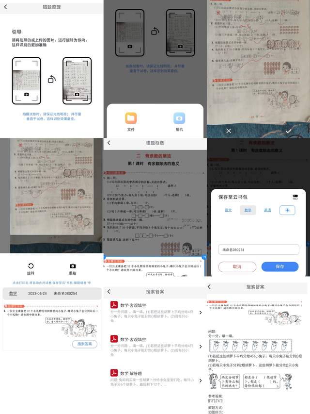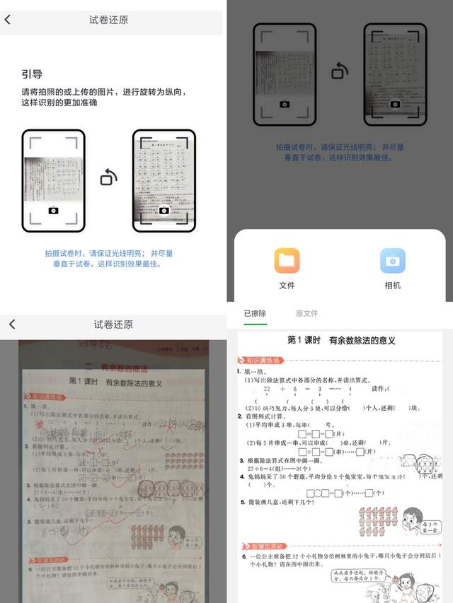 对于整张试卷的再呈现也有独到的做法,拍照上传试卷时软件会对试卷进行黑白色彩增强及原试卷填写笔记的擦除,呈现在眼前的是原始空白试卷,在线可进行拼图处理,多模版可选,打印或者在线解答都很方便。