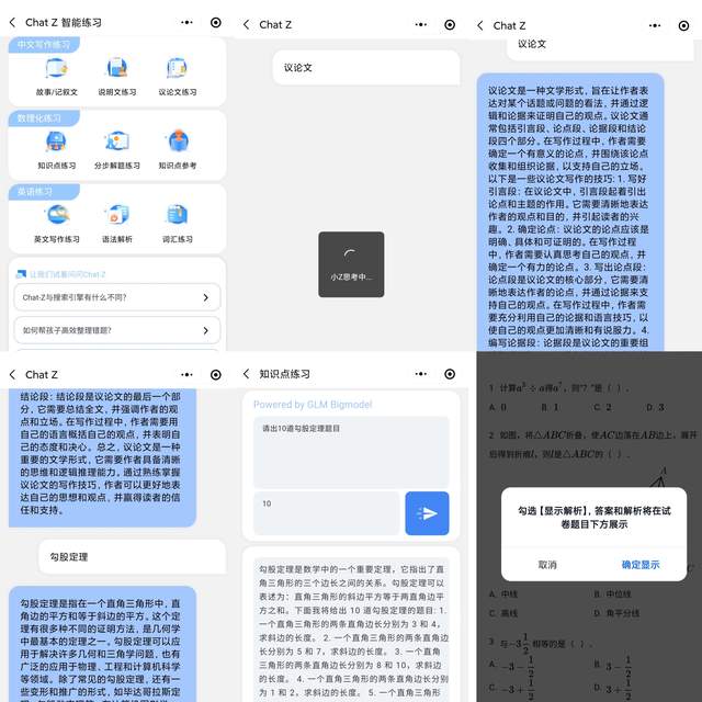 陪伴过孩子学习的家长对于知识点的认知肯定会更深一些,不会做的题目归根到底还是知识点的掌握不够扎实,理解不够深刻,应用不够灵活,联想至像应用Chat Z 智能练习,将最前沿的AI技术应用于孩子个性化的作业自主辅导,打造专属AI作业助手。对应不同学生进行作业定制,有针对性进行辅导,有的放矢,查漏补缺,深层逻辑就是Chat Z后台基于智能AI的ChatGLM千亿大模型,家长通过重点学科知识点选取和Chat Z对话框语言输入等方式,针对孩子学情完成作业辅导,AI技术还支持写作指导、数理化知识点、英语专项练习,结合一键打印选项,联想至像Z1作业打印机呈现在眼前的是专属定制的作业项目