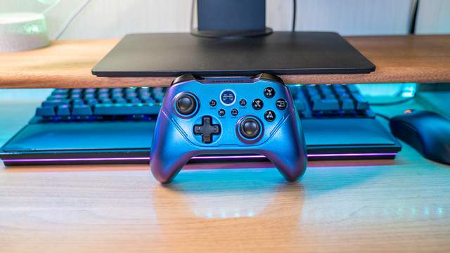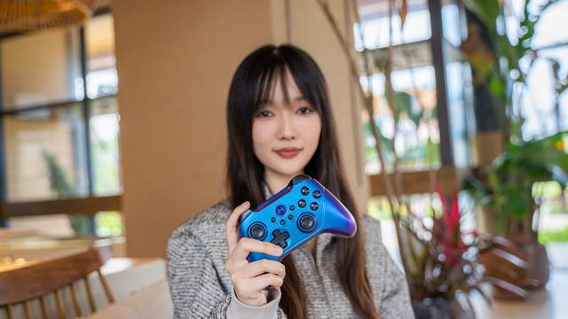 正面直视北通阿修罗2Pro星河无线版手柄,外壳呈现出高饱和度蓝颜色,而稍微斜视手柄,会发现蓝色的外壳会变为紫色,这种独特的外观设计不仅提升了手柄的视觉吸引力,也为游戏体验增添了一份特别的氛围,在游戏体验中,这种独特的颜值都能给人带来全新的感受。