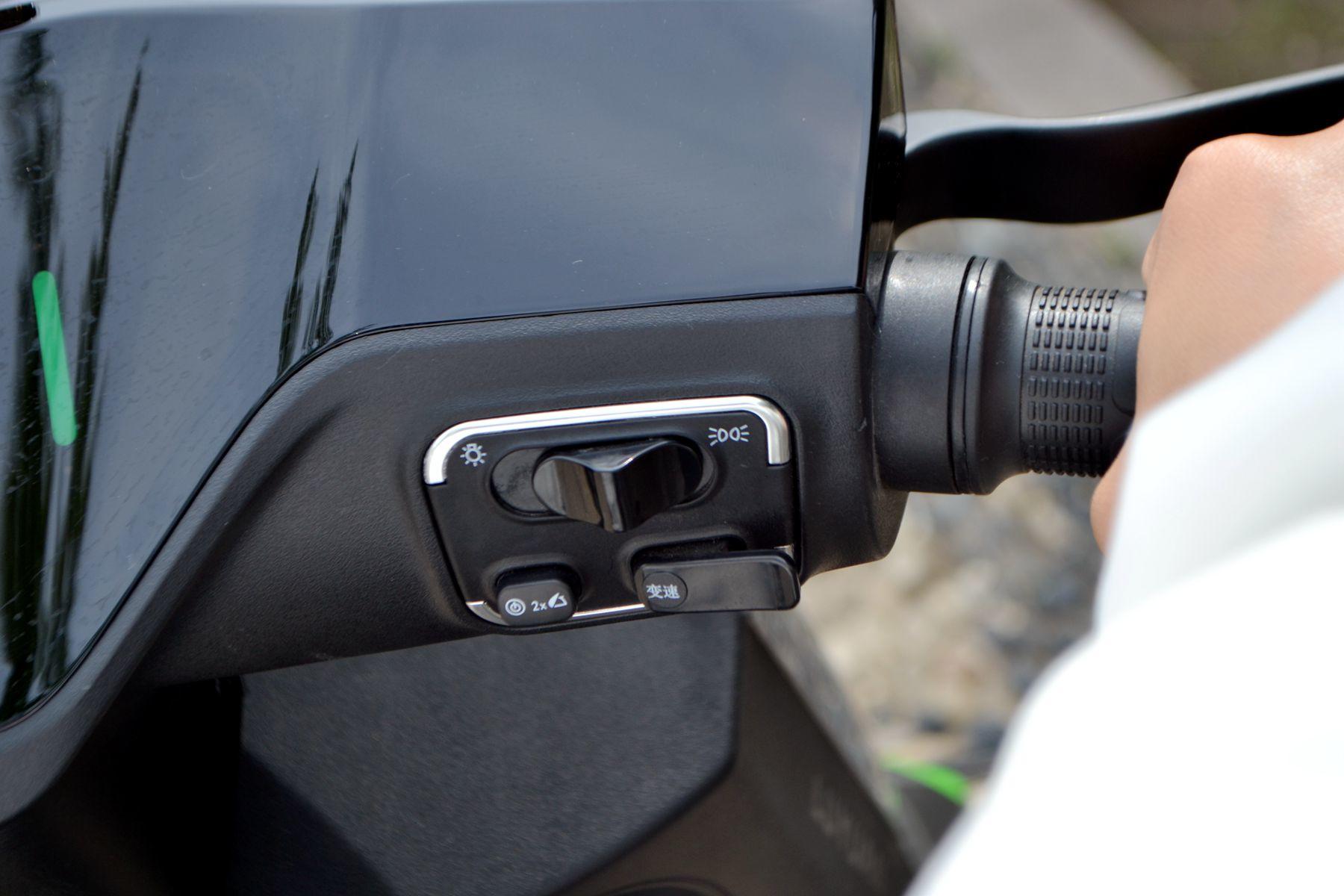 通过左侧把手可以切换远光近光灯,可以看到远光灯模式下,远处会照的非常亮,比普通电动车要亮很多。