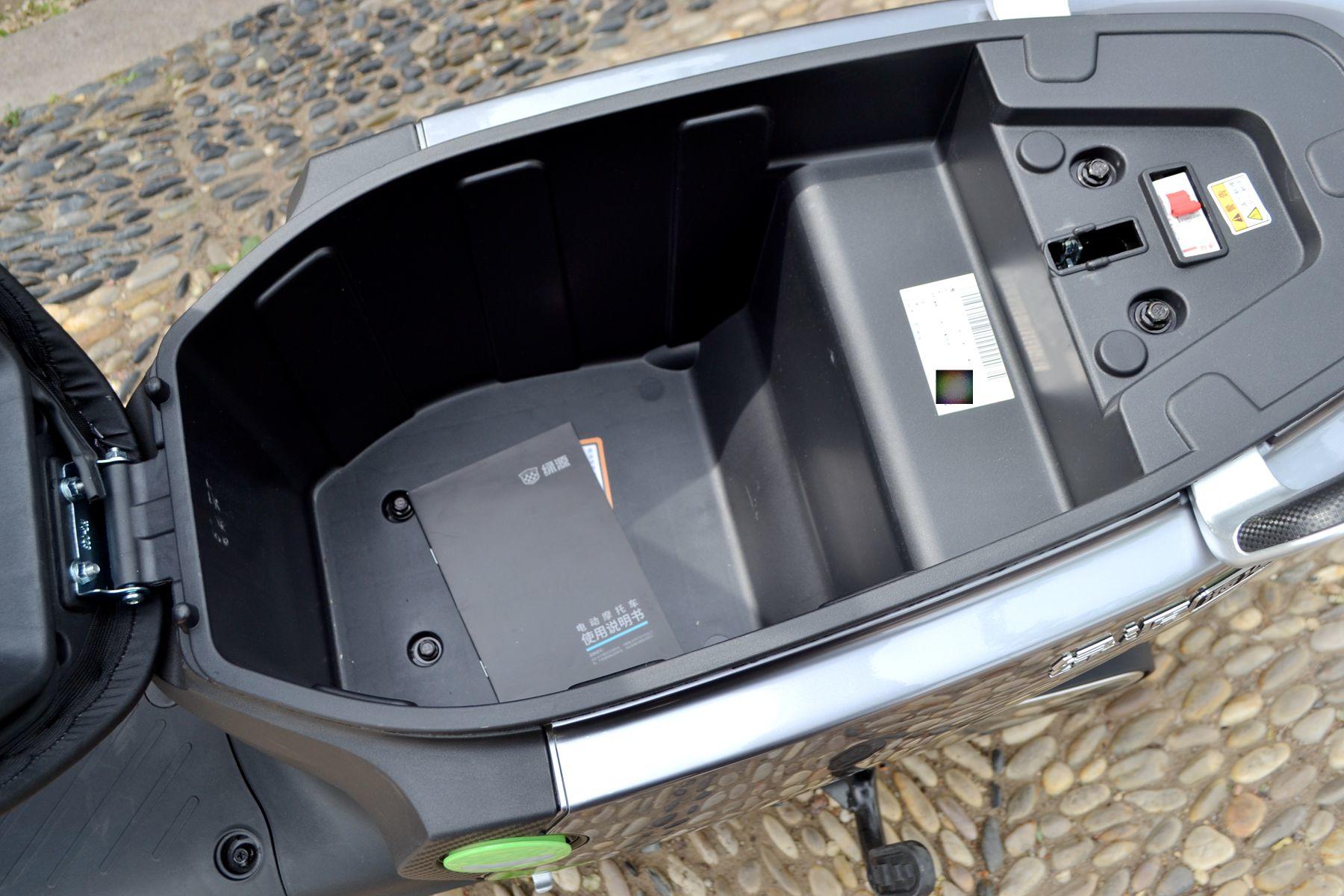 最后再聊聊绿源S70在设计方面的一些细节,我个人觉得比较实用的点,储物空间主要集中在鞍座下方,打开鞍座的方式有三种,可以用传统的钥匙左旋打开,还可以用我刚刚提到的APP上一键打开,还可以在车把右侧下方的鞍座按键,双击打开,很方便。打开后,可以看到储物空间非常大,装个头盔后还可以空闲非常多的空间。