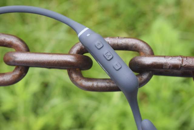 机身右单元顶部的三枚按键除音量调节和切歌用的+/-键外,中间则为功能键。我们可以实现开关机(长按3秒)、唤醒语音助手(双击)、播放/暂停(单击)、切换不同模式(三击)等操作,十分的方便。另外,对于耳机来说,不止于听歌,能否做到清晰通话也很重要。耳机采用智能AI通话降噪,通过发射声波来抵消环境噪音。实测在户外运动时,仍能做到清晰交流、顺畅沟通。