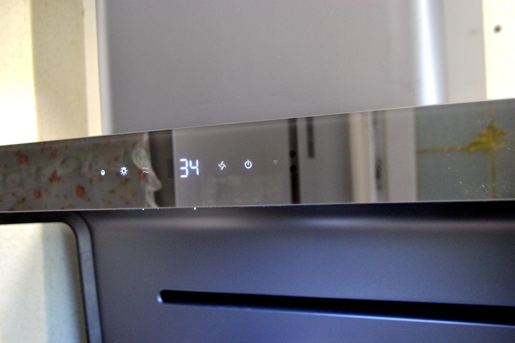 在米家智能净烟机S1的中间位置是一个隐藏式的触控操作面板屏,可以看到米家智能净烟机S1共设有三个不同风力的档位,分别是低档、高档和爆炒,不过如果联动了米家燃气灶的话,档位会随着火力大小自动切换不同档位,而中间的数字屏幕,显示的就是屋内的PM2.5数值,可以实时显示当前的PM2.5值,这样的话,如果对产品不是特别自信,应该是不会把厨房做饭时的PM2.5数值,直接呈现给用户吧。值得一提的是,这款净烟机还支持手势操控。从左到右挥手为开机,再次回收就是风力档位调节,从右往左是关机,手势操控可以在做饭时,不方便用手操作按键时使用,避免油污粘到面板。