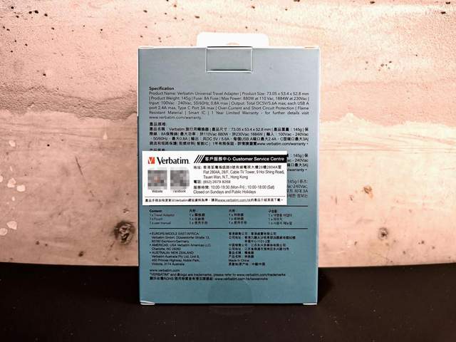 而在包装的背面,整体以中绿色为主色调,并以纯黑字体印刷有多种文字语言,详细描述与罗列出威宝旅行转换快充插头的各项性能参数和厂牌信息等,同样给大家带来一目了然的感觉。