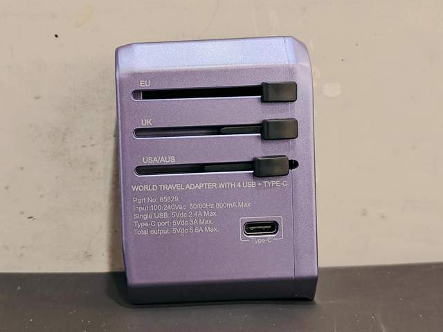 而在威宝旅行转换快充插头底面的位置上,同样以浅紫色为主色调,一共带来了 4个标准USB-A接口,在4个接口顶部还拥有通电指示灯。同时,在接口下方,还印刷有清晰的英文介绍标识,USB-A接口单口能带来最高2.4A的输出和多口最高5.6A输出。