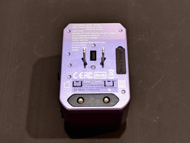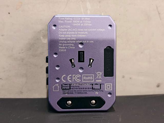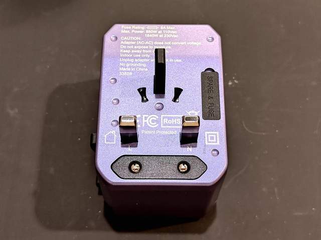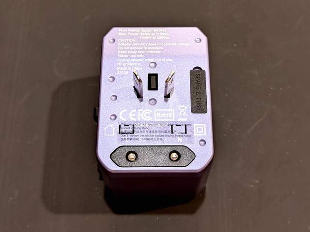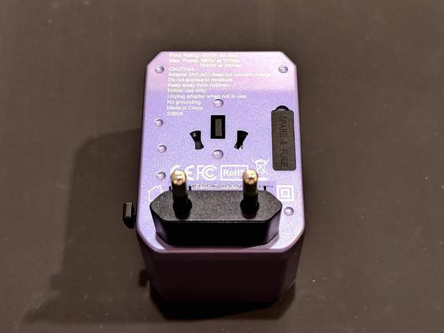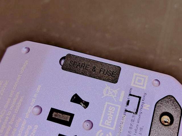 同时在背面右侧边上的位置上,拥有一个与浅紫色背景色彩具有鲜明对比的纯黑位置,这里则是威宝旅行转换快充插头的内置8A保险丝,为旅行转换快充插头带来了多一重保护,确保了整体的用电安全,以及能够承受最高110V 880W或230V 1840W的功率转换使用。